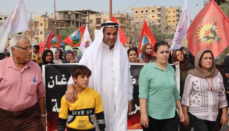 مشاركة مجلس المرأة في شمال وشرق سوريا في المسيرة التي نظمها أهالي مدينة الرقة تنديداً بهجـ.ـمات الاحتــ.ـلال التــ.ـركي على منـ.ــاطق شمال وشرق سوريا