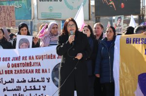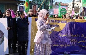 وفي نهاية المسيرة تم إلقاء كلمتين باسم التنظيمات والحركات النسائية في شمال وشرق سوريا الكلمة الأولى ألقتها السيدة “أمينة عمر ” باللغة الكردية والثانية ألقتها السيدة “مايا حديد” باللغة العربية
