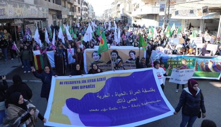نظمت الحركات والتنظيمات النسائية في شمال وشرق سوريا مسيرة جماهيرية في مدينة قامشلو بمناسبة اليوم العالمي لمناهضة العنف ضد المرأة والذي يصادف ال25 تشرين الثاني من كل عام