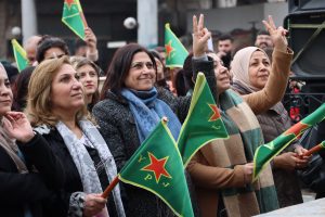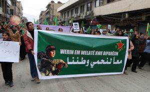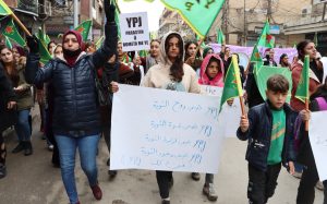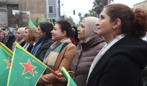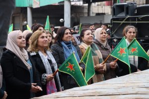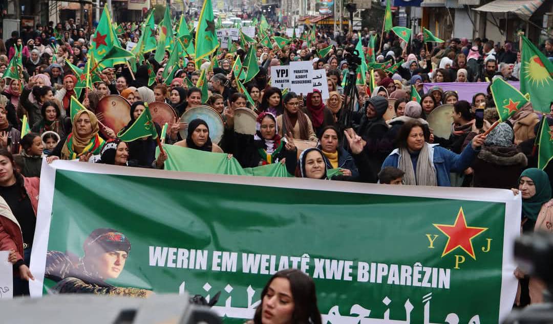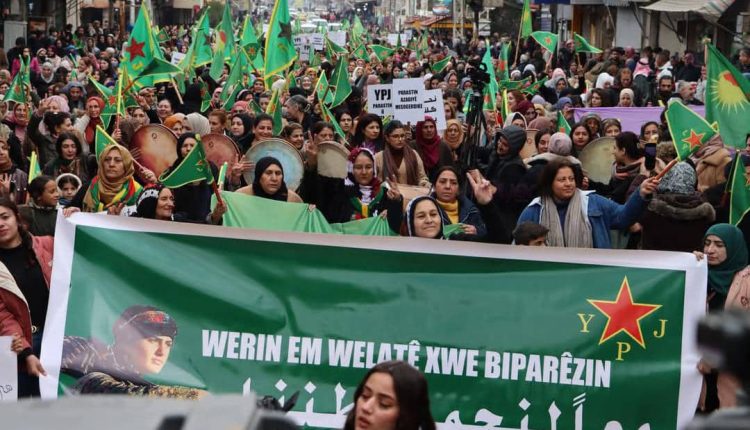 حيث شاركت الآلاف من النساء في المسيرة التي انطلقت من دوار سوني وحتى دوار الشهيد قهر مان في مدينة قامشلو ،رافعين أعلام وحدات حماية المرأة.