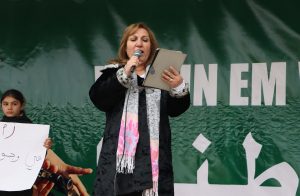 وخلال المسيرة تم إلقاء كلمتين الأولى ألقتها الناطقة باسم مؤتمر ستار ريحان لوقو باللغة الكردية، والثانية ألقتها فيفيان بحو أوسي الرئيسة المشتركة لمجلس التنفيذي بمقاطعة الجزيرة باللغة العربية.