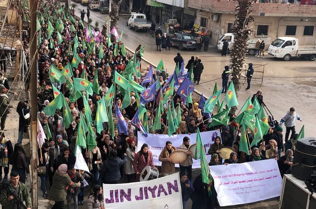 شارك مجلس المرأة في شمال وشرق سوريا في المسيرة الحاشدة، للمطالبة بالمشاركة الفعالة للمرأة في أي عملية وطنية وبناء سوريا المستقبل، تحت شعار “إتحاد النساء السوريات ضمان لفلسفة المرأة ، الحياة ، الحرية”، وذلك في مدينة الحسكة.