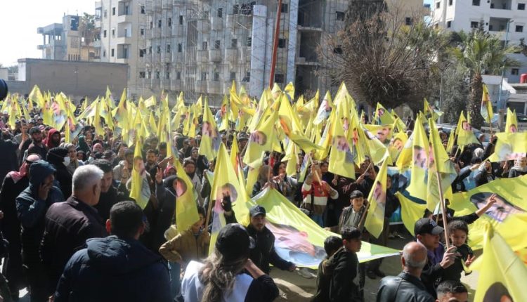رفع المشاركون في المسيرة لافتتات تطالبة بالحرية الجسدية للقائد عبد الله أوجلان