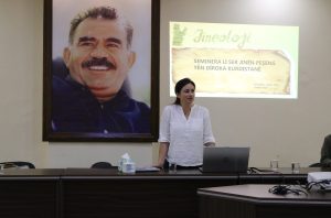 و من ثم قامت عضوة أكاديمية جنولوجي “علم المرأة”، زوزان سيما بإلقاء المحاضرة مع عرض مشهد سنفزيوني مقدم من قبل أكاديمية جنولوجي عن النساء الكرديات و كانت على قسمين القسم الأول من المحاضرة كان حول معنى و تعريف التاريخ عبر العصور، و الكتب التي كانت تتحدث عن النساء باسم “كتاب تاريخ المرأة”، مصادر عن تاريخ المرأة الكردية و الكتب التي تمجد دور المرأة الكردية من النواحي الثقافية و الاجتماعية، تطور المرأة، انتفاضات النساء عبر التاريخ.